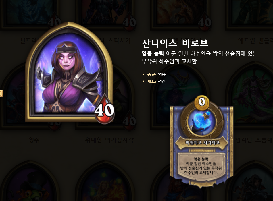 현재 전장의 1위 영웅 잔다이스 바로브는 콩콩이 하나로 그냥 날먹할 수 있는 영웅입니다. 콩콩이가 삭제되면서 간접 너프를 받았습니다. 종족 밴과 관계 없이 초,중,후반 타이밍에 영웅 능력을 활용할 수 있고, 성능도 매우 좋다고 생각합니다. 그렇지만 남들보다 한 템포 빠르게 강한 필드를 형성하기 위해서는 멀록덱이 가장 시너지가 괜찮다고 생각합니다. 전체 버프를 최대한 돌려야지 영웅 능력이 가치가 있겠죠ㅇㅅㅇ; 또한 브란도 찾는 순간 영웅 능력의 가치는 더더욱 올라간다고 생각합니다.
