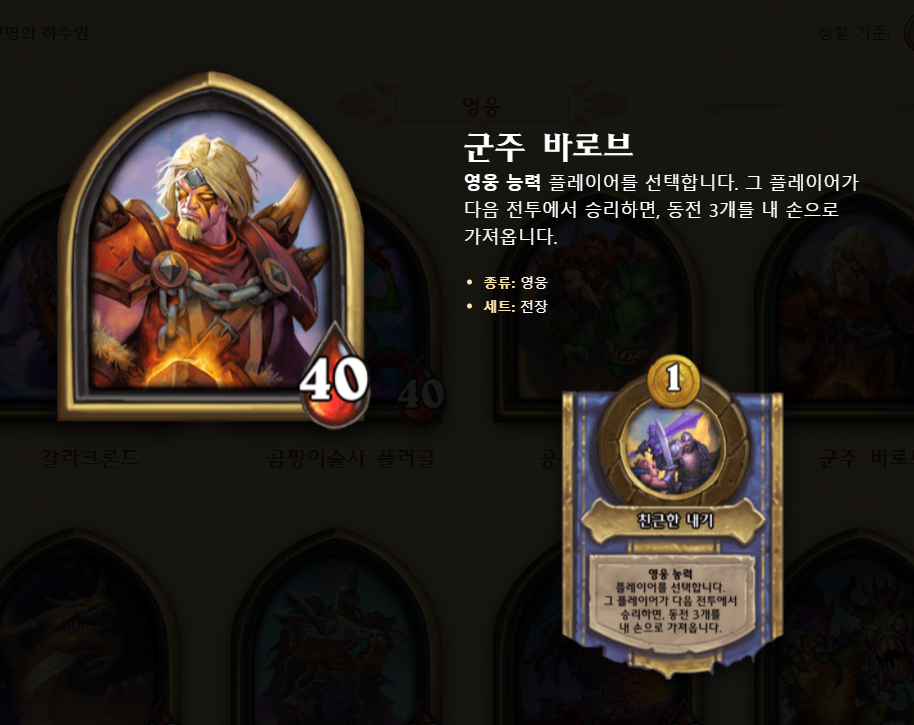 갈라크론드는 영웅 능력 비용이 0이 되면서 S급 티어가 되었습니다. 빠르면 5턴에 6성 하수인을 뽑아 사기를 칠 수 있고, 이제는 레벨업이 뒤쳐지지 않기 때문에 사기칠 수 있게 되었습니다. 물론 잽 슬라이윅, 칸고르 같은 꽝도 나오지만 그럼에도 확률상 좋은 6성하수인이 많기 때문에 사기칠 수 있는 영웅이라고 생각됩니다.