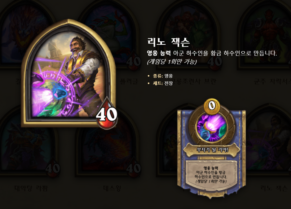 이번 패치로 인해 영웅 능력 횟수가 4회 -> 5회로 너프를 받았습니다. 너프를 받았지만, 이전 밀하우스 마나스톰 너프처럼 완전히 못 쓸 정도는 아니라고 생각합니다. 어차피 핵심은 첫 번째 황금카드를 통한 체력 관리, 두 번째 황금 카드 + 6성 발견을 통한 강력한 덱 구성을 짜는 것이기 때문에 완전히 못 쓸정도 까진 아니라고 생각합니다. 5턴에 첫 황금 카드를 가져오지만, 1성 황금 하수인이 뜨면 복구가 안될정도로 말리기 때문에 리스크가 매우 커졌습니다ㅇㅅㅇ;