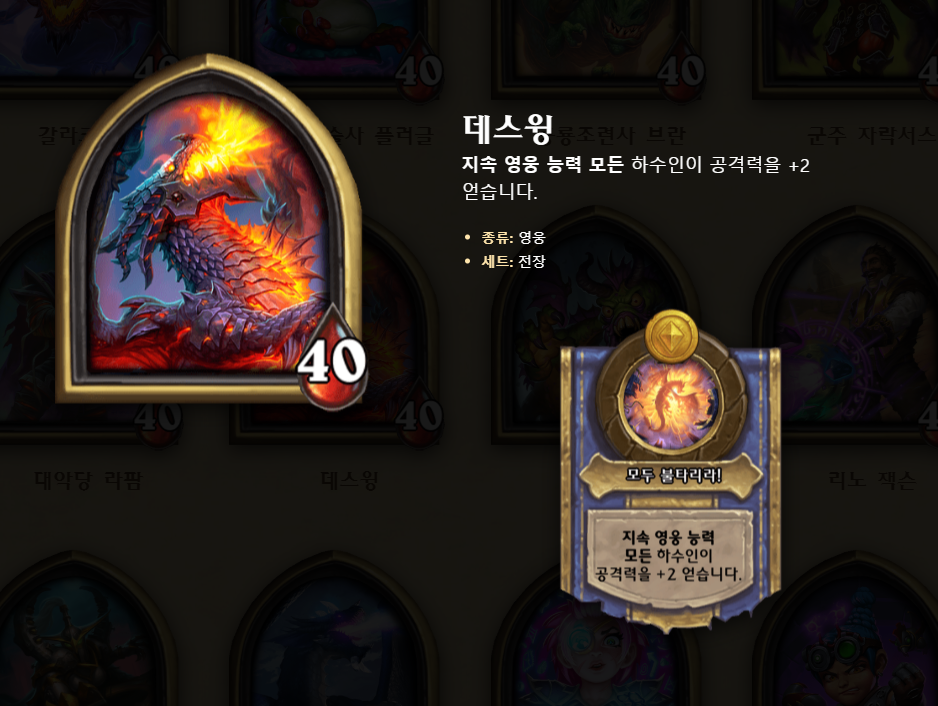 데스윙은 기계가 밴이 아니면 B급 이상영웅이라고 생각합니다. 처음에는 야수가 밴이면 쥐떼가 없어서 안좋겠다고 생각했는데, 오히려 다른 플레이어들도 쥐떼가 없기 때문에 셀프카운터를 맞을 일이 없죠. 거기다 데스윙 기계덱은 천보, 죽메 토큰덱을 구사하여 유일하게 완성 멀록덱을 이길 수 있기 때문에 B급은 된다고 생각합니다.