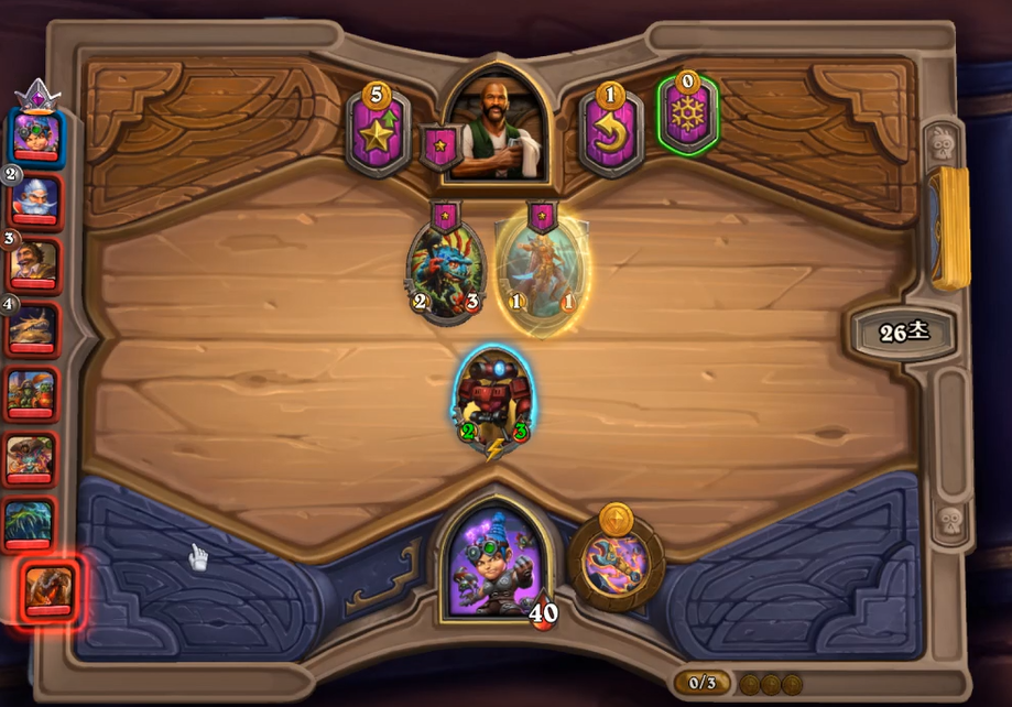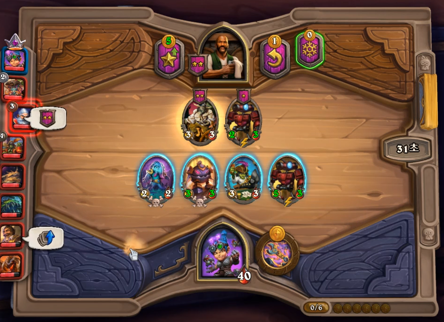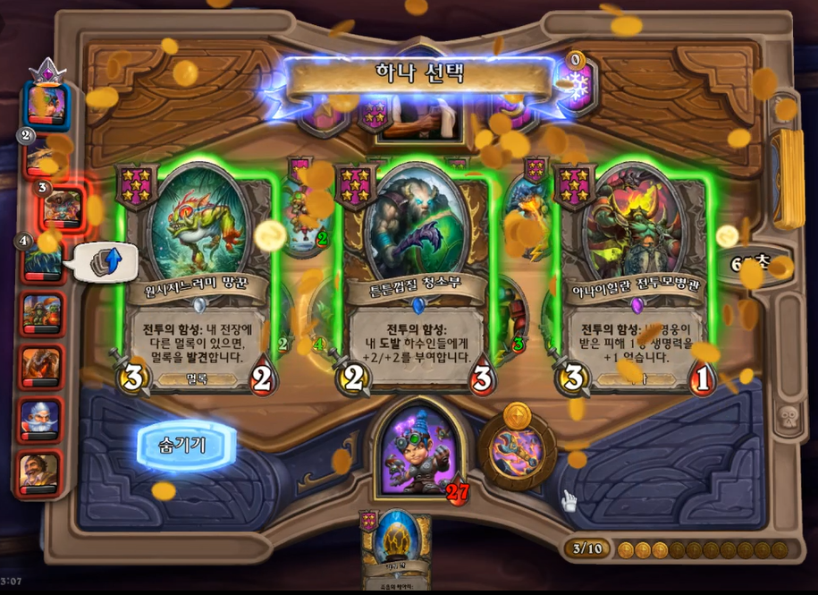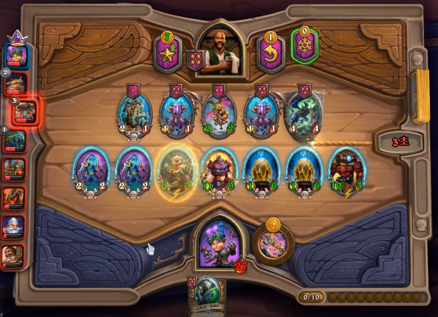 3 턴 하수인 상점입니다. 초소형 로봇 시작시에는 굳이 팔고 하수인 2개를 살 필요 없고, 최대 리롤 2번을 해서 기계 하수인 구매 + 다음에 구매할 하수인을 얼려 놓으면 됩니다. 초소형 로봇의 스탯이 4/3이기 때문에 최소 4/4 스탯 하수인 하나를 잡아 먹을 수 있어서 상당히 좋습니다.