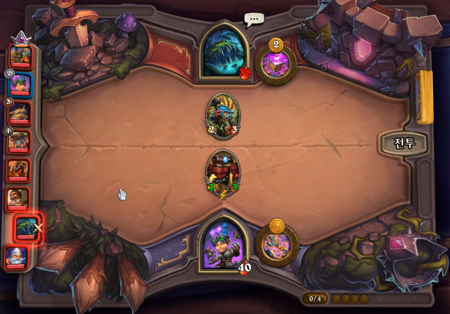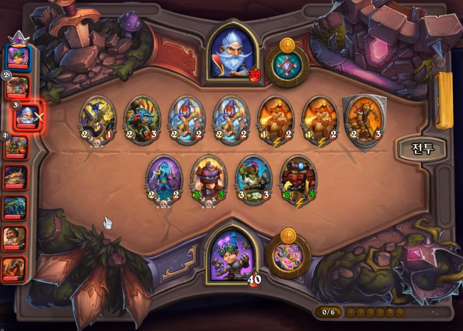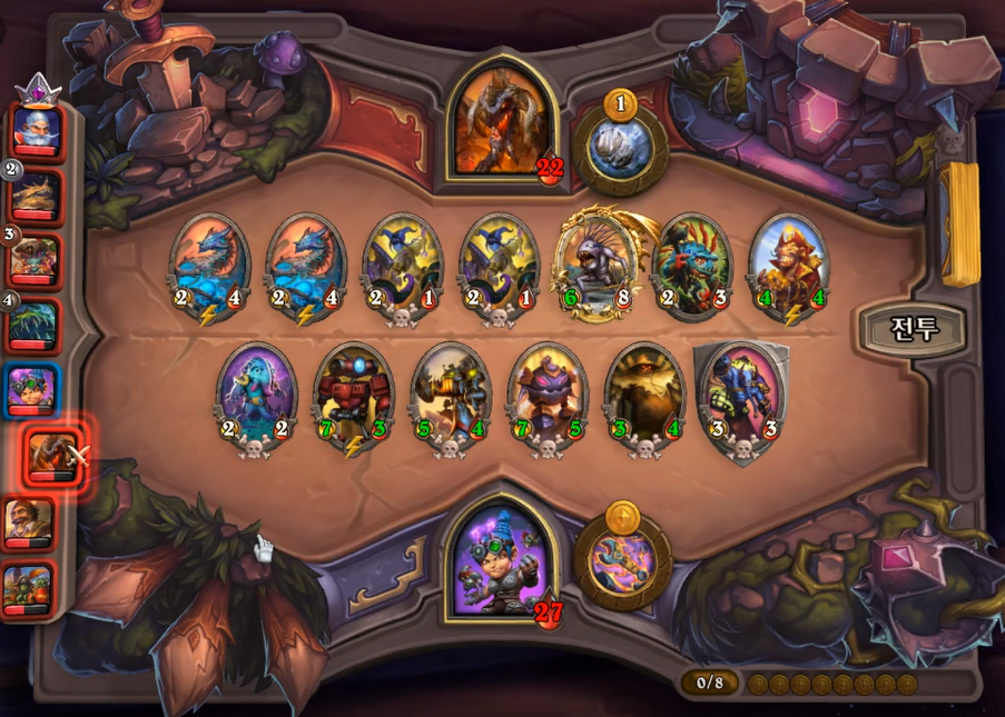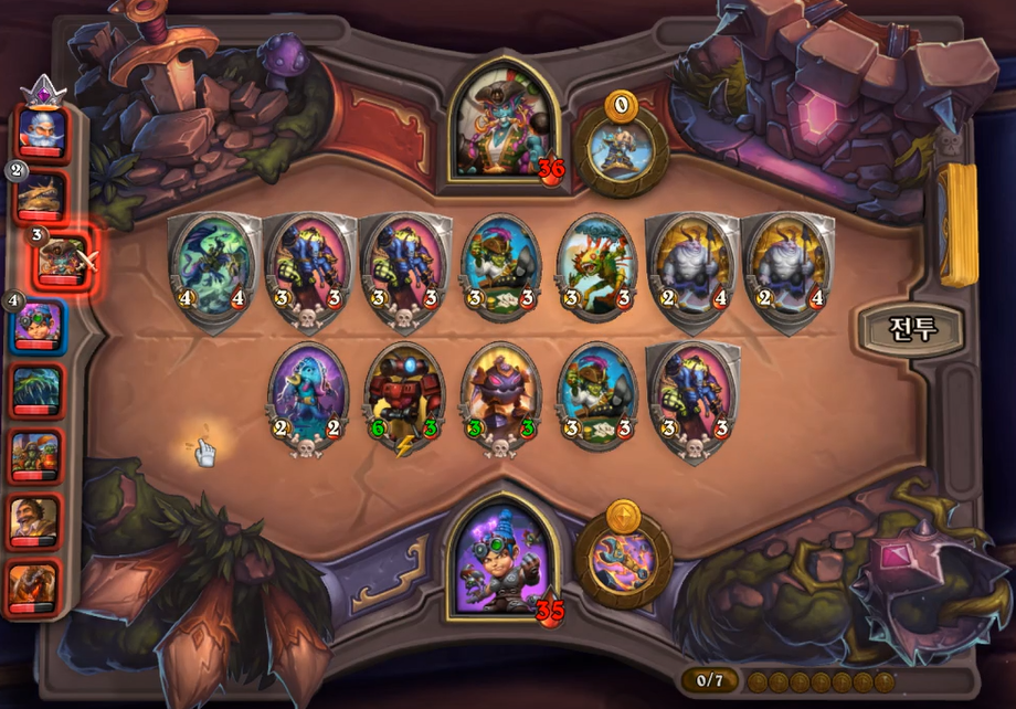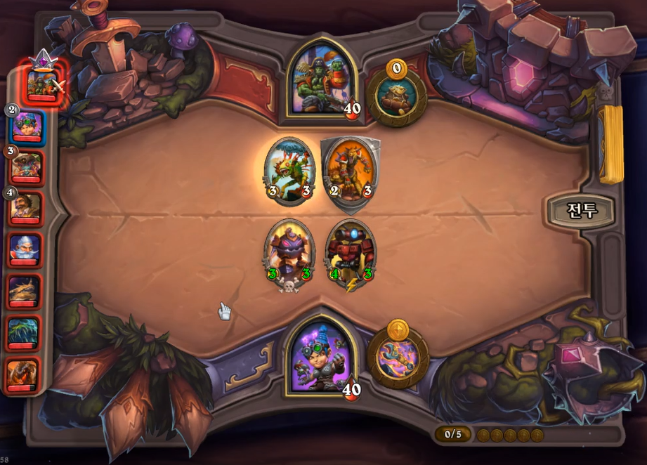 1 턴 하수인 상점입니다. 1턴 밀리피센트 마나스톰에게 있어서 최고의 상점입니다^^; 이렇게 초소형 기계 스탯을 2/3으로 시작하면 1,2 턴은 웬만하면 지지 않습니다. 그리고 2턴이 되면 초소형 기계 스탯이 3/3이 되기 때문에 바위 웅덩이 사냥꾼, 용혈족 부관같이 2/3 스탯 하수인에게 이길 수 있습니다.(1턴 전투 장면, 2턴 상점은 생략하겠습니다.)