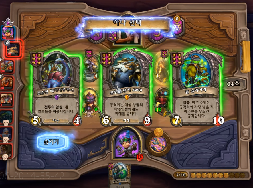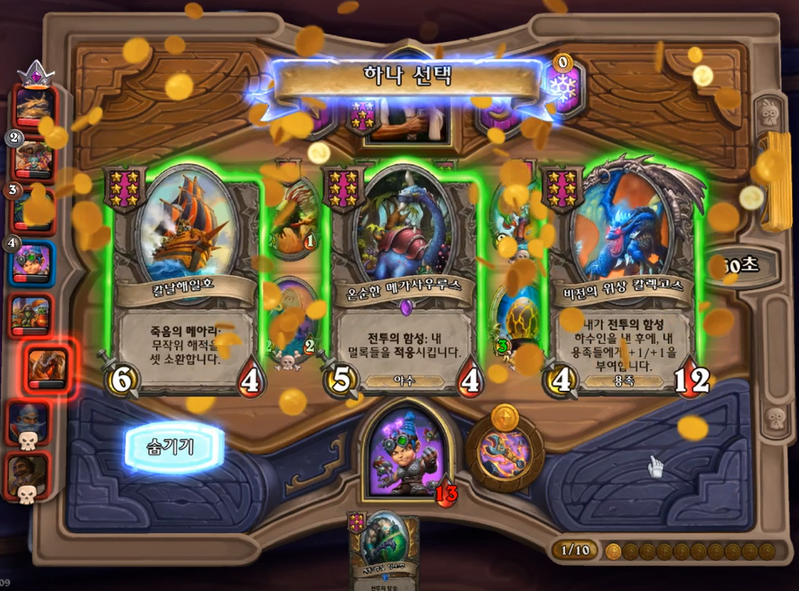 마지막 하수인 상점입니다. 칸고르가 없는 것이 아쉽지만, 나름 기계 덱을 완성했습니다. 리븐 데어도 마지막에 떠줘서 나름 최종 스쿼드를 갖췄다고 생각했습니다. 상대가 멀록 덱을 이긴 걸로 봐서는 용덱을 완성시키지 않았나 생각했습니다.