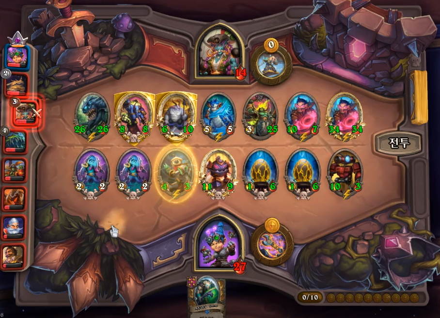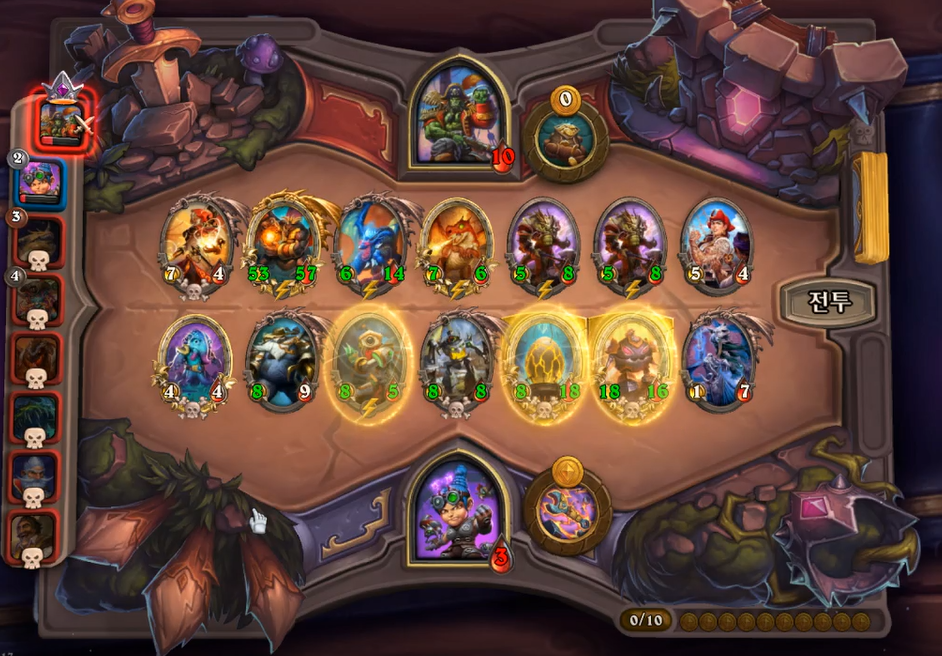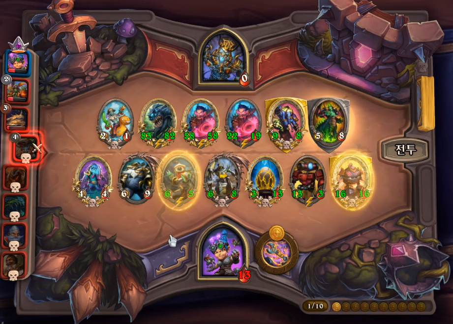 4턴 전투는 밀하우스가 풀필드를 채워 패배했습니다. 아무리 땜장이가 초반에 강해졌다고 해도 밀하우스, 후크터스크 같은 영웅들에겐 못 이기네요.