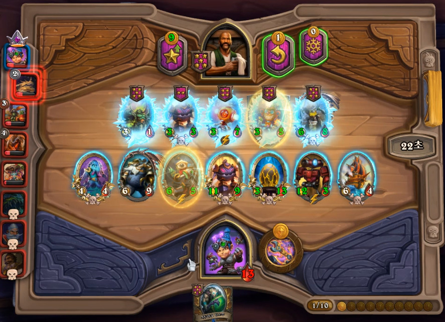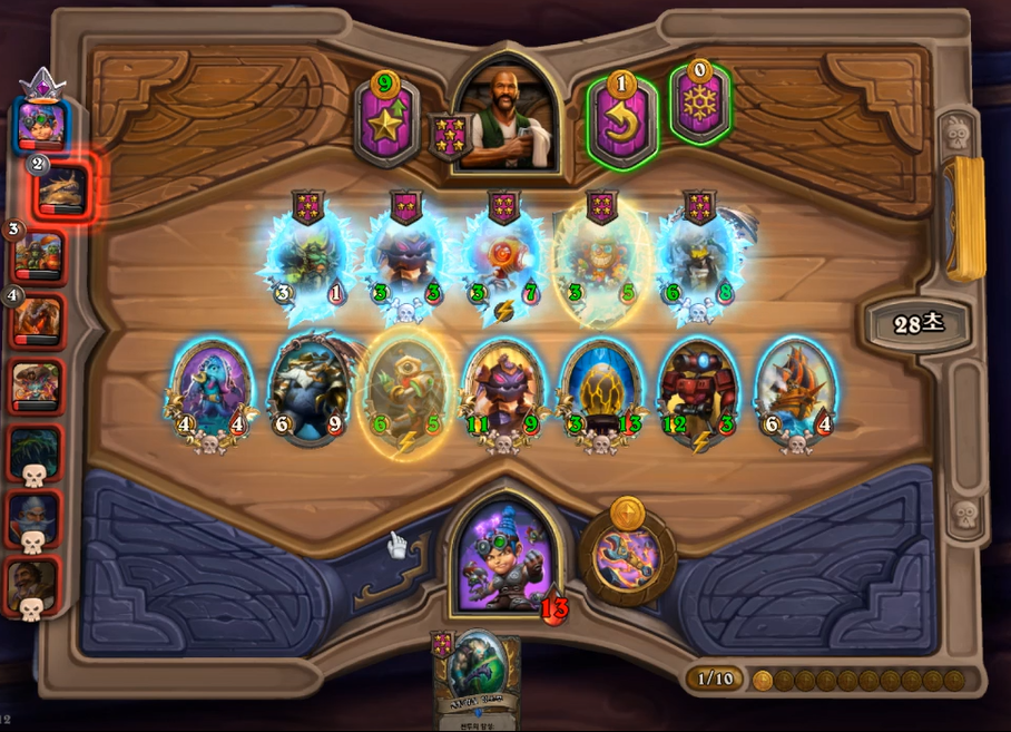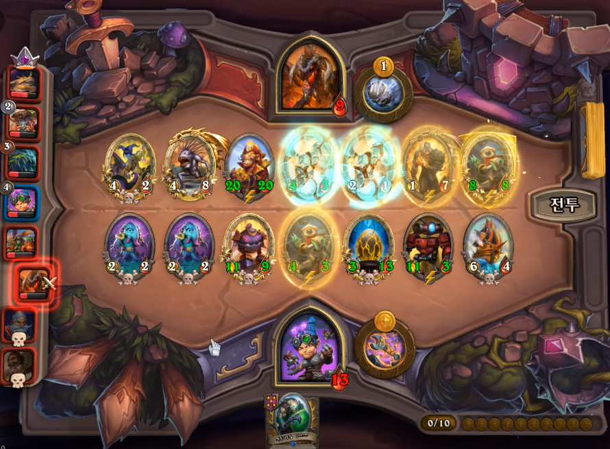 10 턴 하수인 상점입니다. 황금 기계알을 만들었는데 아쉽게도 6성 발견에 실패했습니다. 그래도 한발(느조스의 피조물) 남았네요^^; 배치는 상대가 네파리안이기 때문에 증식하는 위협이 발린 콰광로봇을 앞 배치했습니다.
