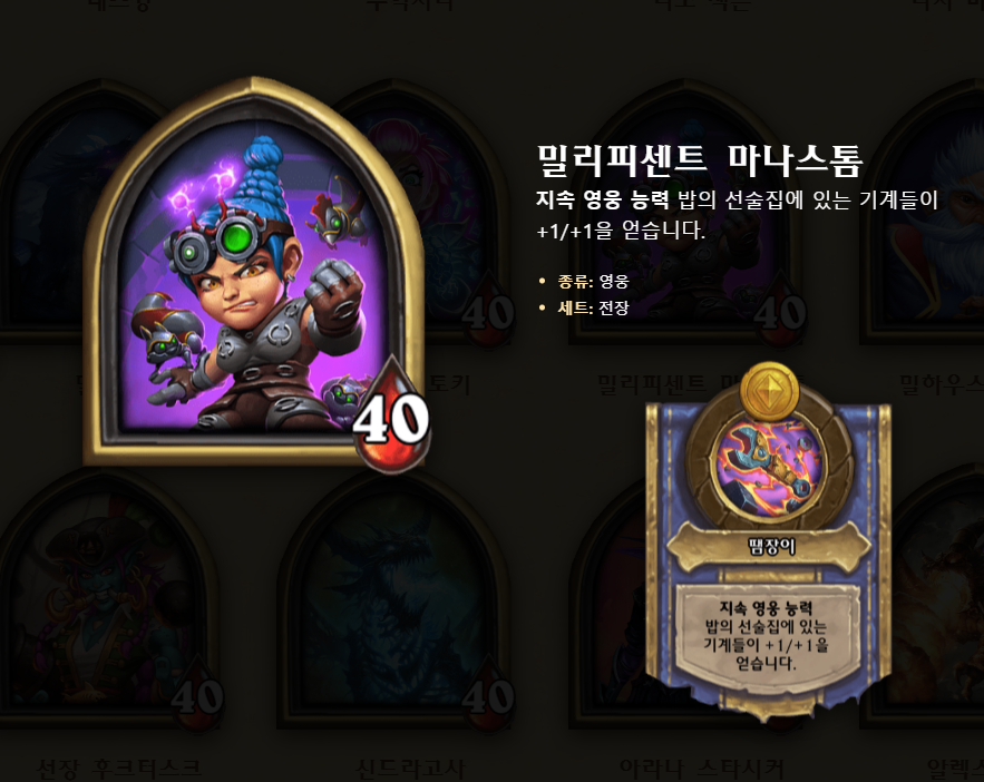 안녕하세요, 검은너구리입니다. 최근 해적 패치가 된 지 일주일 만에 다시 밸런스 패치가 이루어졌습니다. 그 과정에서 땜장이가 기계 하수인 공격력 +2 버프에서 +1/+1 버프로 롤백되었습니다. 원래도 밀리피센트 마나스톰을 좋아했지만, 개인적인 생각으로는 버프를 받았고, 최소 A급으로 올라왔다고 생각합니다.