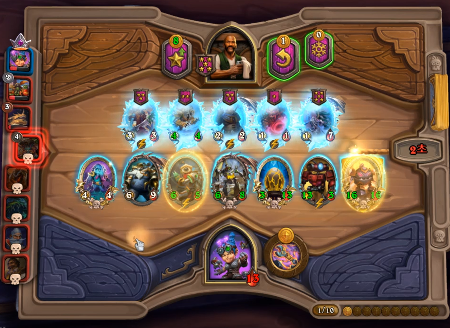 8 턴 전투도 역시 상대가 5 레벨을 찍어서 무난하게 승리했습니다. (요그샤론 같은 경우, 초반 이후로는 영웅 능력의 활용도가 떨어지기 때문에 저 또한 5레벨을 빨리 찍는 플레이를 좋아합니다.)
