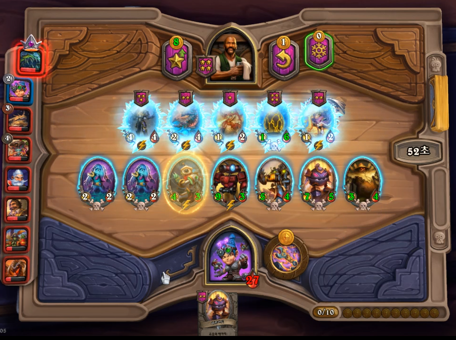 8 턴 하수인 상점입니다. 반사 로봇, 콰광 로봇을 구입했습니다. 살짝 상점운이 없었지만, 상대가 레벨업을 했기에 괜찮다고 생각했습니다. 밀리피센트 마나스톰 같은 경우 5 레벨을 빨리 찍을 필요 없이, 안녕 모듈, 기계 알, 반사로봇 같은 성능 좋은 하수인들을 구매해 주시면 됩니다. 5레벨을 찍는 경우는 황금 카드를 만들어서 칸고르를 노려야 할 때 정도라고 생각합니다.