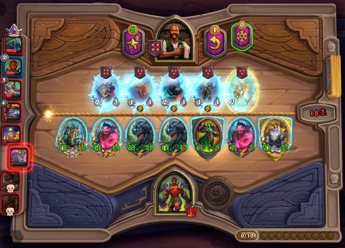 아라나 스타시커는 써보지는 않았지만, 그렇게 잘 풀린 아라나 스타시커를 본 적이 없는 것 같습니다. 생각보다 리롤 7번은 조건이 까다롭습니다. 정석적인 운영을 했을 때, 8 골드 전까지는 웬만하면 리롤을 돌리지 않고, 4성 이후(하수인 자리 5개)부터 변신해봤자 리롤 4번 이상해야 노즈도르무보다 이득을 보기 때문에 개인적인 생각으로는 좋지 않다고 생각합니다. 특히 광적인 사우로 리스크가 2성으로 올라가면서 더욱 힘이 빠졌다고 생각합니다. 이 친구도 리롤 조건을 7개-> 4개 정도로 감소해야 쓸만하지 않을까 생각합니다.