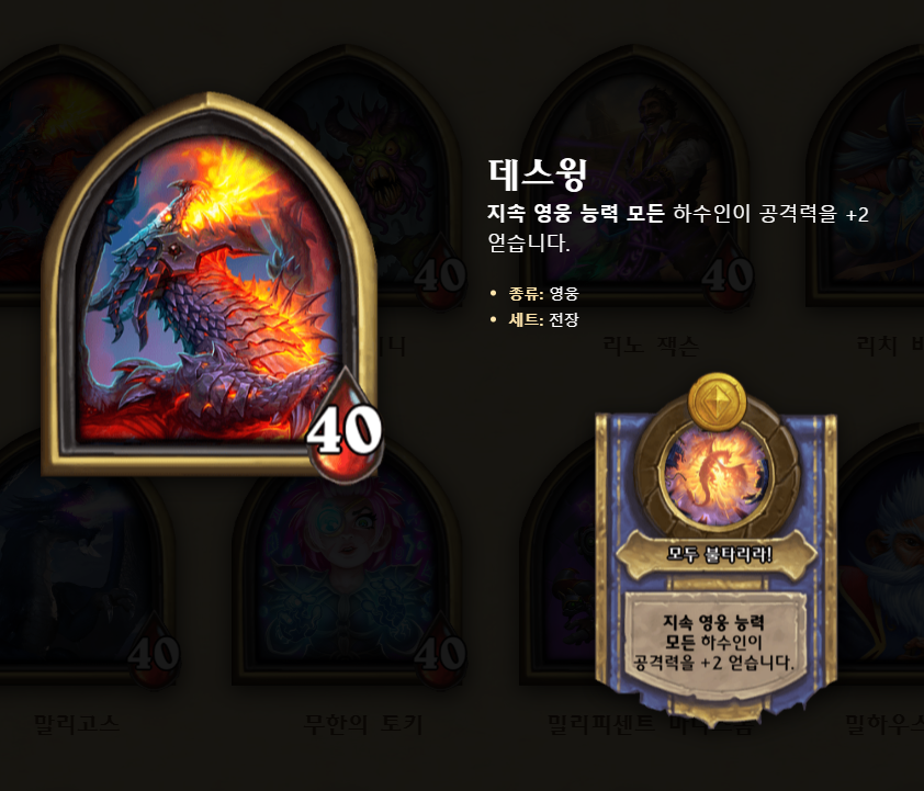 - A급 영웅(필드 개입력이 높은 영웅) -> 춤추는 다릴, 피라마드, 캘타스 선스트라이더, 밀하우스 마나스톰, 희망의 끝 요그샤론, 애드윈 벤클리프, 핀리 므르글턴 경, 마이에브 섀도송, 밀리피센트 마나스톰