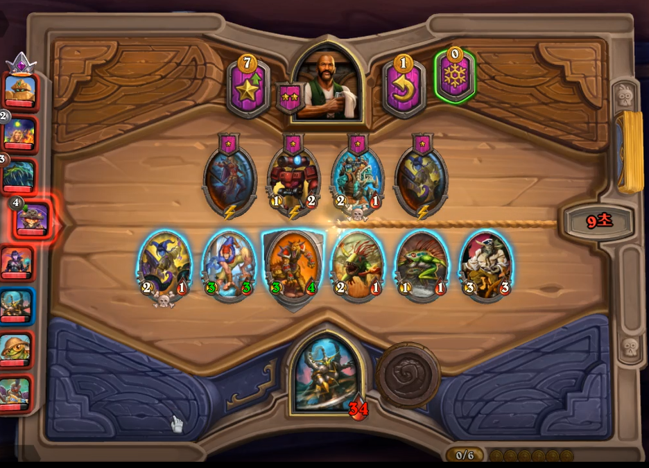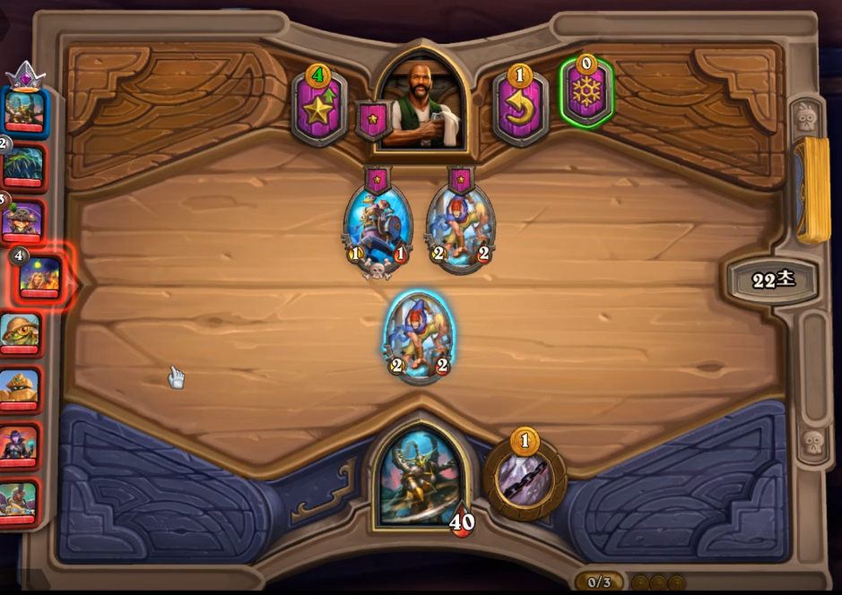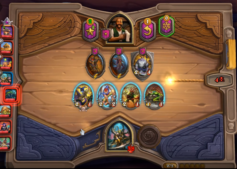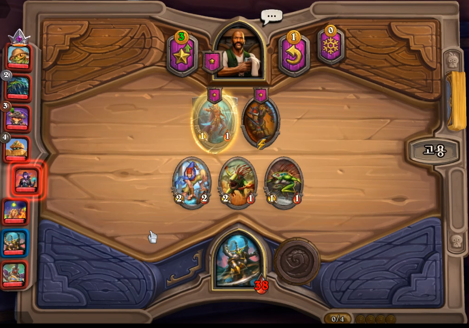 4 턴 하수인 상점입니다. 이번에는 레벨업을 하였고, 다시 한번 영웅 능력 + 리롤 해서 하수인 구매(남쪽 바다 선장)를 했습니다.