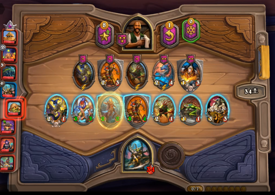 7 턴 하수인 상점입니다. 멀록 바다 사냥꾼과 헌신적인 영웅을 동시에 황금카드로 만들었습니다. 체력 여유가 없다 보니 브란 + 국밥 맨을 했네요. 이 후로는 멀록 버프를 계속 찾아보았기에 생략하겠습니다.