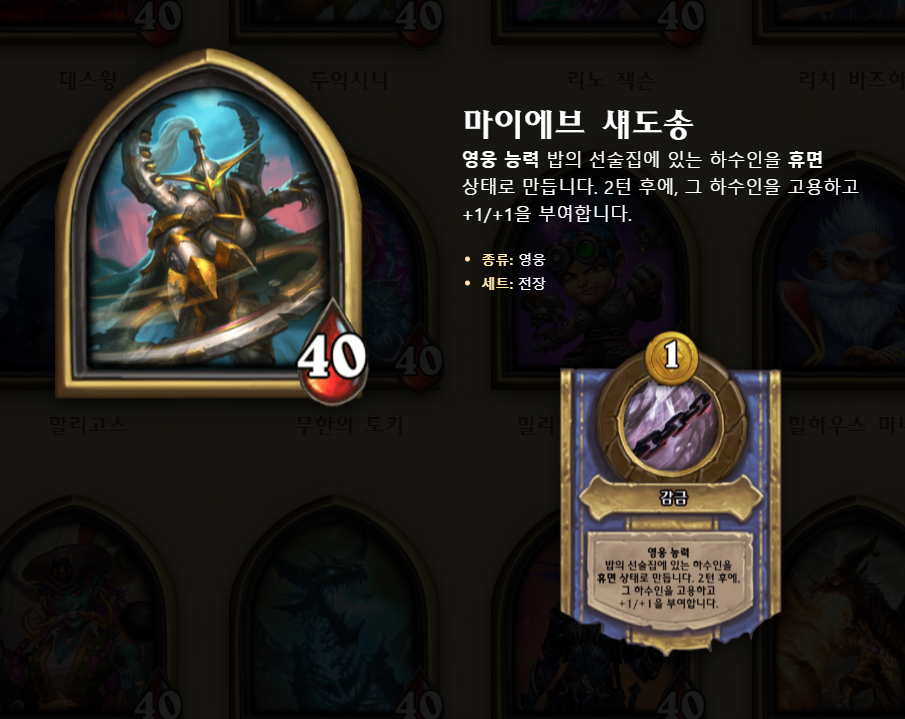 그 동안 있었던 하수인 리롤 페널티가 사라지면서 C, D급 취급받던 마이에브가 저는 S 혹은 A급으로 올라왔다고 생각합니다. 이제는 라팜식 운영을 하면서 무난하게 플레이하면 5성 발견 혹은 6성 발견의 기회가 많아져서 저는 좋은 영웅이지 않나 생각이 드네요. 또한 7 골드 상점 시작 시, 감금으로 하수인을 가져오면서 풀필드를 채울 수 있어 부담 없이 8 골드 때 레벨 업 + 영웅 능력을 써서 패스트 레벨업이 가능해진 것도 굉장히 마음에 듭니다.