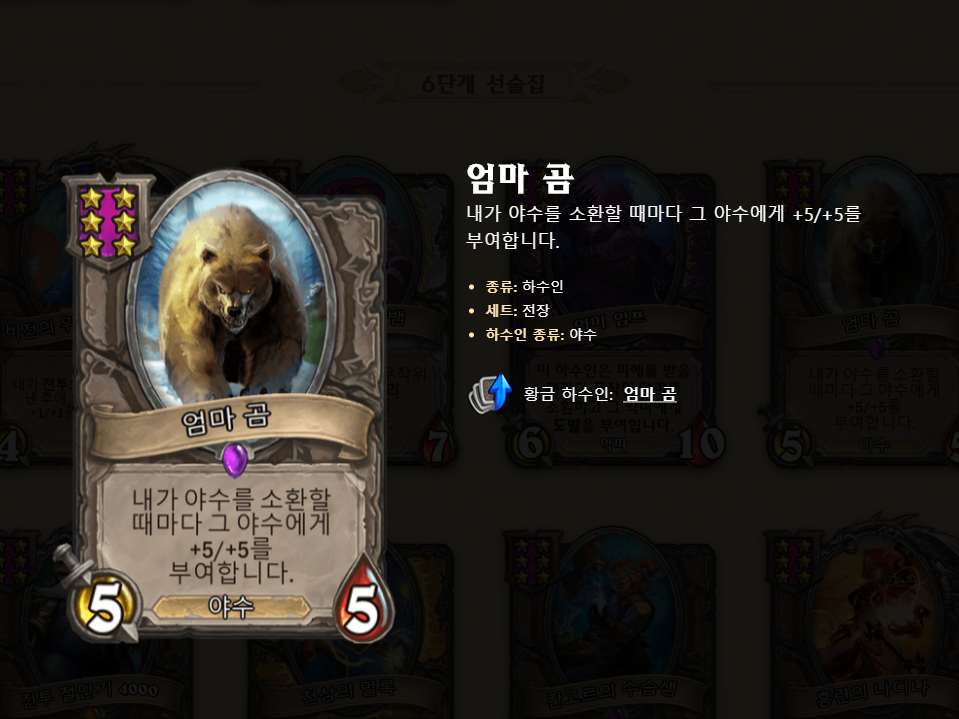 야수 덱도 크게 2종류(골드린+리븐 데어 야수 덱, 엄마곰 토큰 야수 덱)가 있지만 결국 중반을 버텨야 합니다. 중반을 버티기 위해서는 5성 전까지 다른 덱을 짜다가 6성 발견으로 엄마곰을 찾는 경우를 제외하고는 무리의 지도자 + 쥐떼가 핵심입니다.