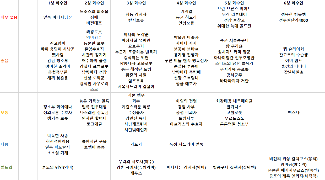 하지만 개인 성향이 다르기 때문에 본인이 가장 잘하는 영웅을 선택하는 것이 좋습니다. 저 같은 경우도 전시 관리인이나 엘리스 스타시커를 B급으로 놓았지만, 솔직히 플러글이나 선장 유도라가 훨씬 재밌기 때문에 많이 선호합니다ㅎㅎ;