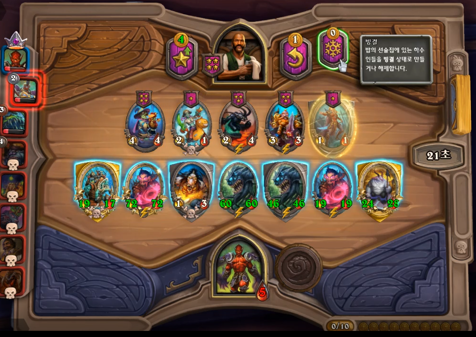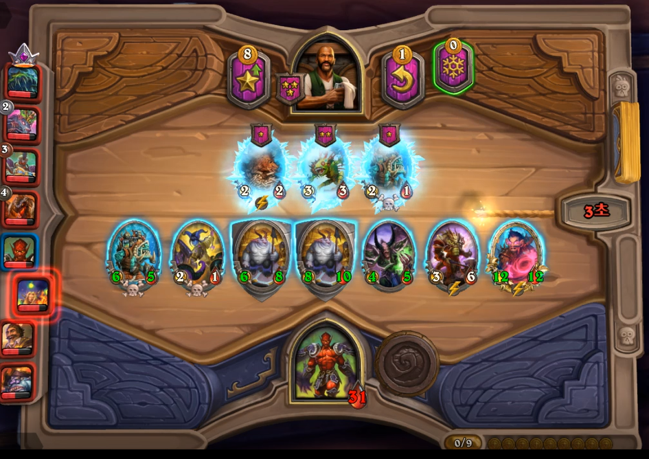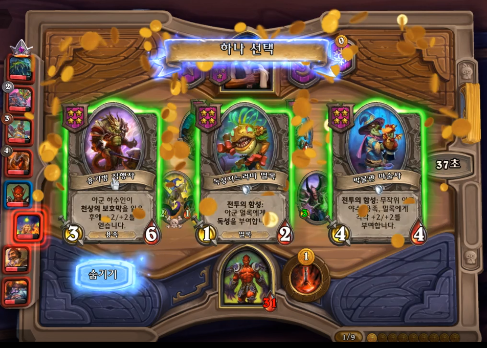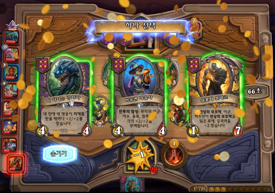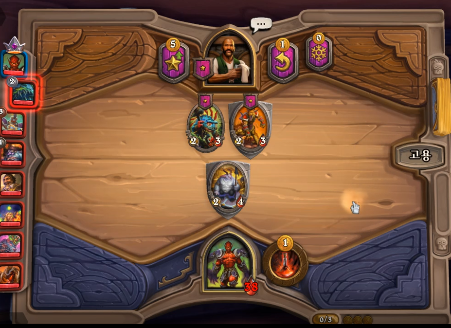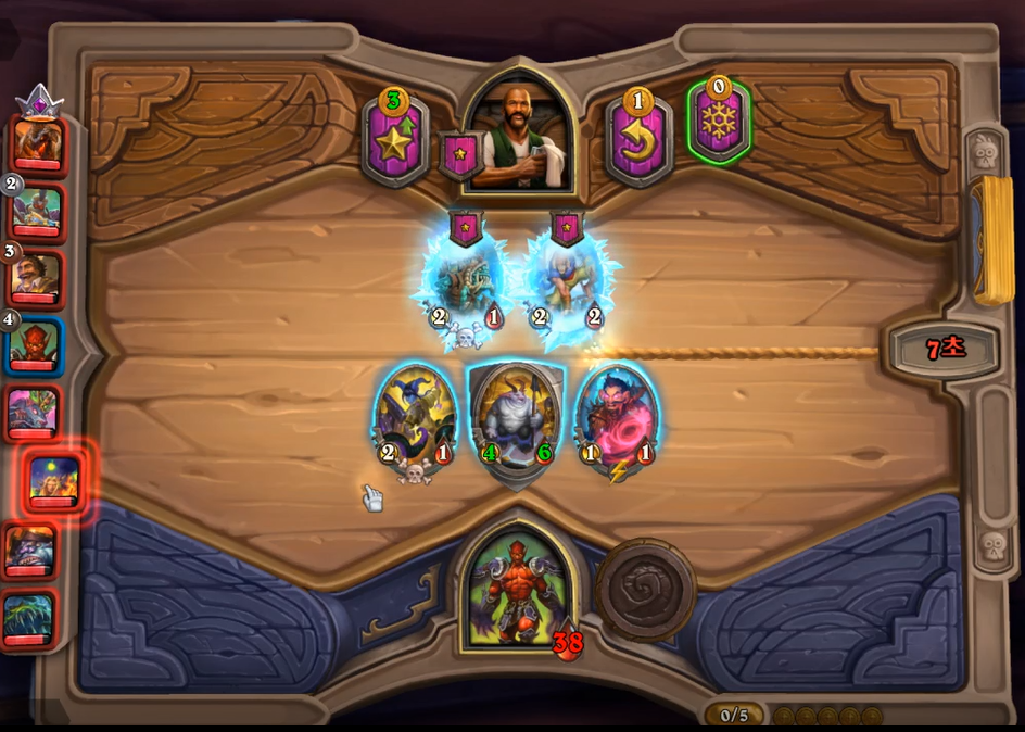 5 턴 하수인 상점입니다. 분노의 명인을 구매해야 했고, 필드가 약하다고 생각해서 레벨업을 미뤘습니다. 분노의 명인이 2개 정도 있으면 굳이 3레벨을3 레벨을 빨리 찍을 필요가 없습니다. 황금 카드가 만들어질때즘 3 레벨을 찍어 4성 발견으로 떠다니는 감시자를 찾으면 됩니다.(전투씬 생략)
