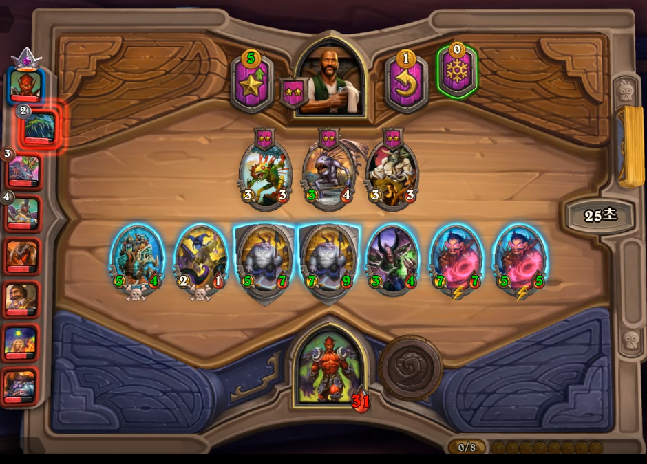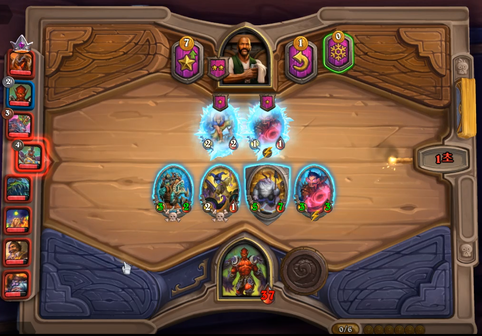 7 턴 하수인 상점입니다. 아쉽게도 4성 발견을 실패했습니다. 그래도 야비한 소악마, 분노의 명인, 악독한 시종의 스탯이 지금 타이밍에 꽤 높은 편이기 때문에 질 것이라고는 생각하지 않았습니다.