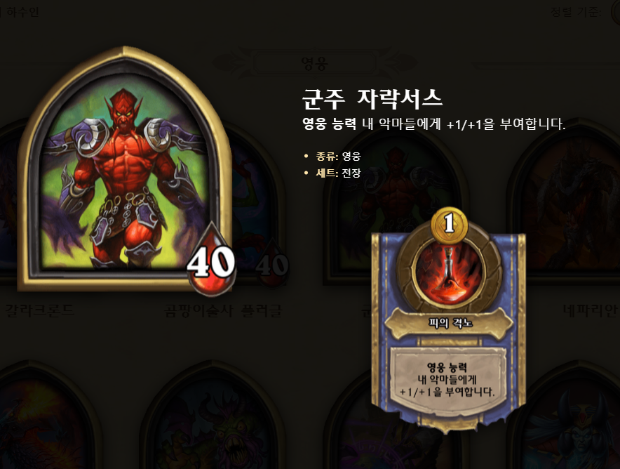 군주 자락서스의 영웅 능력은 1골드로 내 악마들에게 +1/+1을 부여합니다. 영웅 능력이 2 골드 일 때, F급 영웅이던 자락서스가 이번 버프를 통해 상당히 좋아졌습니다. 과거의 티리온 폴드링과 비슷한 효과로, 필드 개입력이 전체 전장 영웅들 중 가장 강력합니다. 다만, 악마 하수인 수가 적고, 하수인 효과도 별볼일 없기 때문에 딱 순방용으로 최적화되어있습니다. 그러다 보니 자락서스 승률이 통계적으로는 꽤 높은 편이죠ㅇㅅㅇ; 자락서스의 빌드업은 크게 2가지 있습니다.