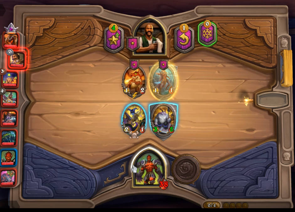 4턴 하수인 상점입니다. 악독한 시종 구매, 레벨 업, 영웅 능력을 사용했습니다.