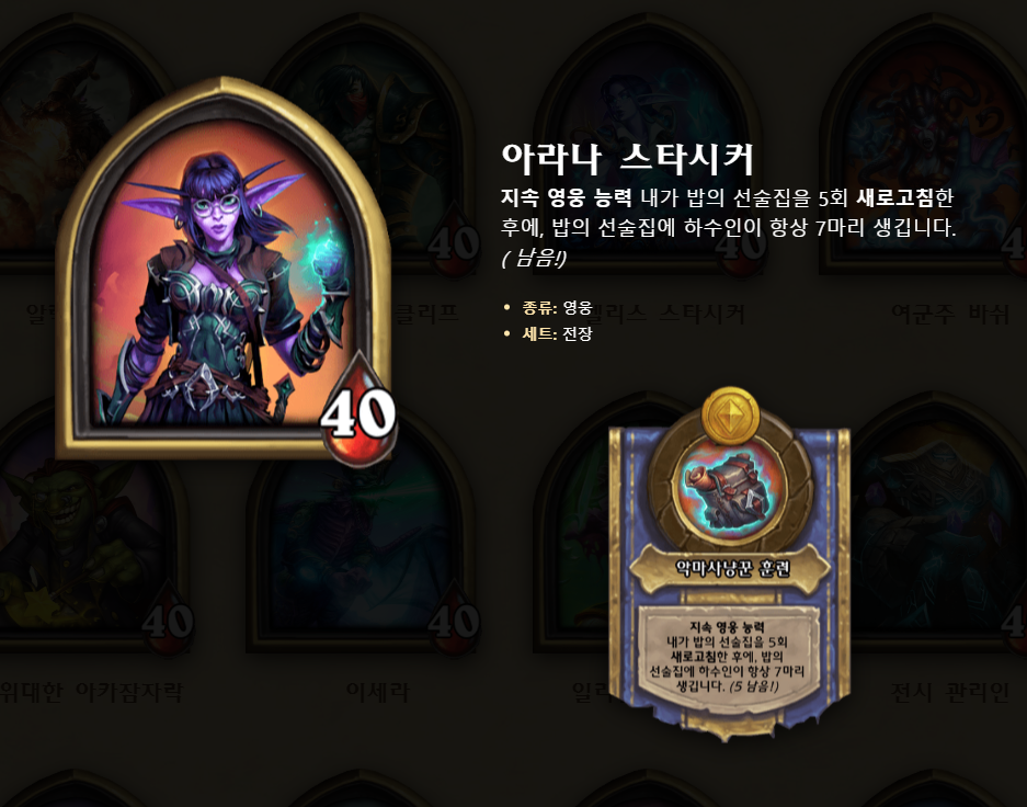 아라나 스타시커의 영웅 능력은 리롤을 7번 하면 밥의 선술집에 하수인이 항상 7마리 생깁니다. 처음 출시 당시 민초덱과 시너지가 좋겠다고 생각했는데, 사우로리스크가 2성으로 올라가면서 간접 너프를 많이 받았습니다.