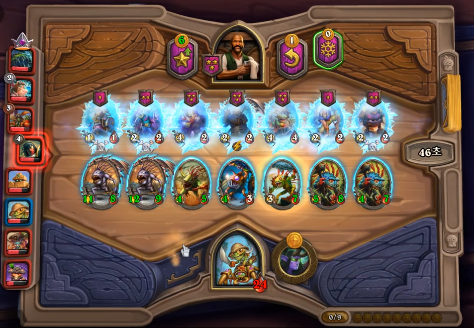 9골드 타이밍에 레벨업을 미루고 퀘스트를 깼습니다.(8 골드 때 리롤 4번, 9 골드 때 리롤 3번) 참고로 아라나 스타시커는 퀘스트를 깨는 즉시 남는 자리에 하수인이 추가됩니다.