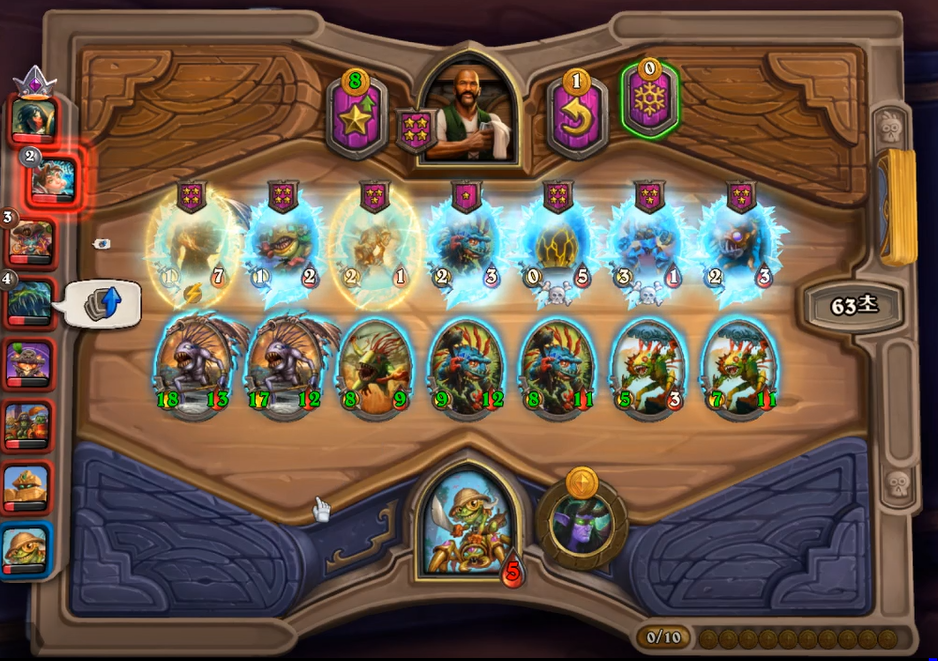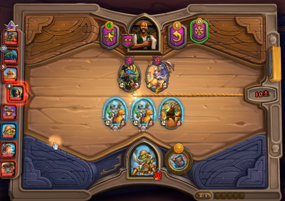 만약 토큰 시작을 했으면 위와 같이 리롤보다는 토큰을 팔고 하수인 2개를 구매하시는 것이 좋습니다. 어쨌든 영웅 능력이 활성화되기 전까지는 체력 10 낮은 패치워크이기 때문에 필드는 세게 가져갈 필요가 있습니다.(참고로 영능 능력이 개방되면 아래처럼 영웅 능력 아이콘이 바뀝니다.)