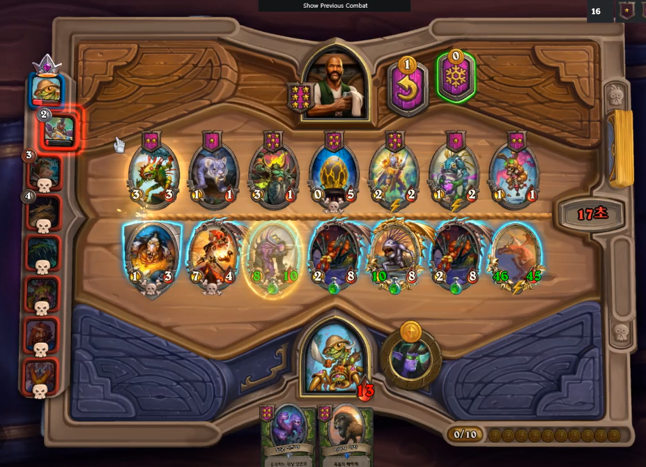 결국 영웅 능력이 8턴 이후(10골드 타이밍)에 쓰이기 때문에 8턴 전까지 패치 워크나 마찬가지이죠. 그리고 4레벨 때 기본적으로 5마리가 나오는데, 2마리 더 나온다고 엄청 좋다고 말하기는 다소 애매한 부분이 있죠. 부정적인 내용만 이야기했지만, 어쨌든 하수인을 찾기 수월하고, 황금 카드를 모으기 좋은 장점도 가지고 있습니다ㅎㅎ; 실제로 아라나 해적 덱을 운영해본적 있는데, 들창코 2장, 바다의 노략꾼 황금 카드 3장으로 게임을 터트린 적도 있었습니다ㅇㅅㅇ;