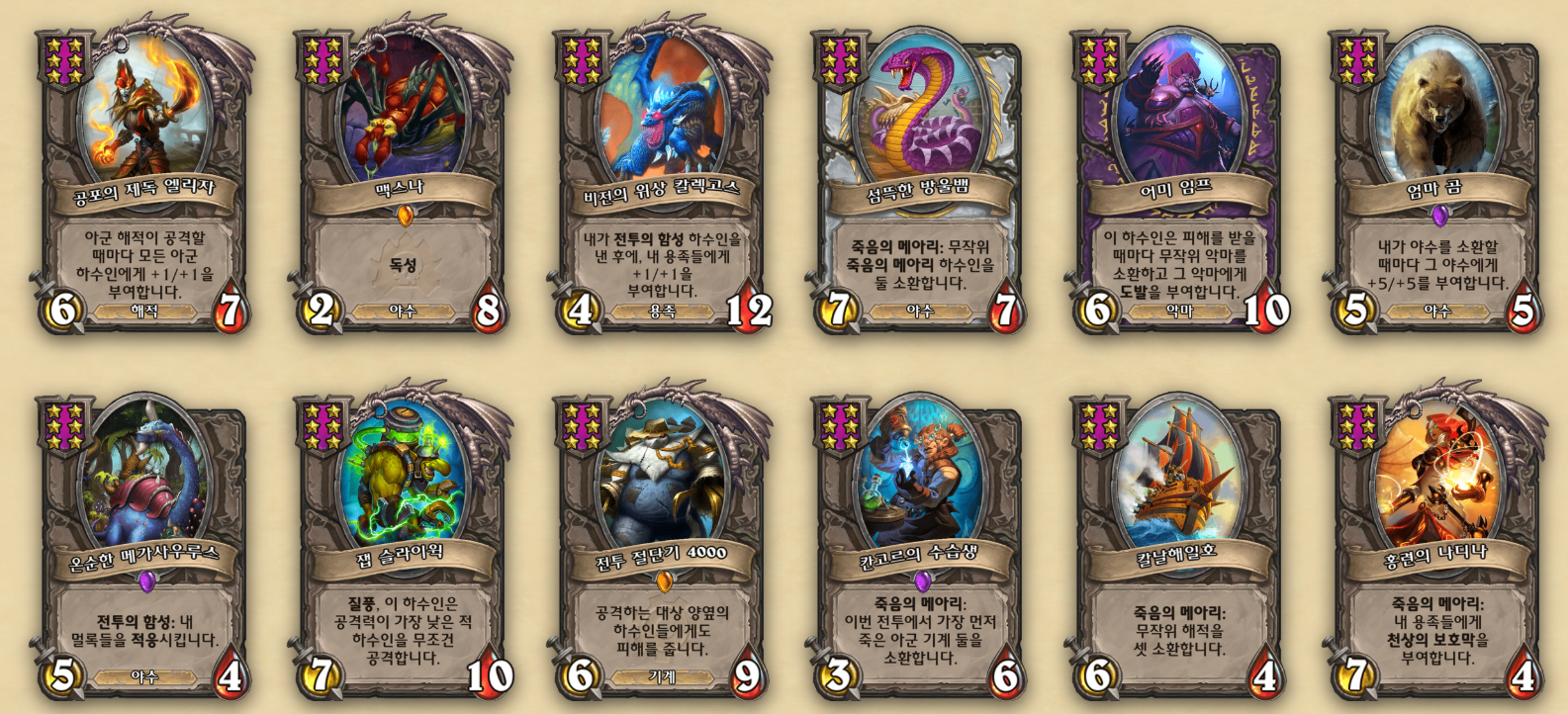보통 칼렉고스(우승), 엄마곰(준우승)이 가장 좋고, 전투 절단기, 어미 임프 정도만 떠도 7 골드 ~ 10 골드 타이밍까지 전투에서 패배하지 않기 때문에 굉장히 좋습니다. 다만, 온순메, 칸고르, 나디나 같은 하수인이 나오면 운영이 꼬일 수 있기 때문에 추천하기에는 애매하죠. 하지만 랜덤 성 영웅 중 재미면에서는 높기 때문에 아메리카 서버에서 저는 많이 플레이했습니다.ㅎㅎ;